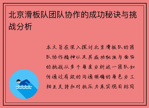 北京滑板队团队协作的成功秘诀与挑战分析